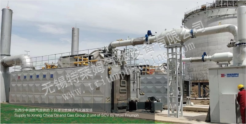 撬裝式浸沒燃燒式氣化器(SCV)主要?dú)饣疞NG接收站或大型城市的大流量LNG或其他低溫介質(zhì),是充分利用天然氣燃燒產(chǎn)生的高溫?zé)煔鉃闊嵩矗邷責(zé)煔庠谒刂挟a(chǎn)生劇烈擾動(dòng),高效加熱浸沒在池中的LNG或其他低溫介質(zhì)盤管。具有換熱效率極高、氣化量與耗氣量約100:1.4、設(shè)備占地小、自動(dòng)化程度高、整體撬裝投產(chǎn)快、氣化量不受氣候影響等優(yōu)點(diǎn)。氣化負(fù)荷可從10~110%之間任意調(diào)節(jié)。